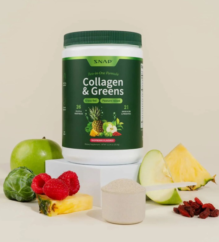 Snap’s Collagen & Greens blends grass-fed collagen with a 26-fruit/veg “super greens” mix in one scoop
